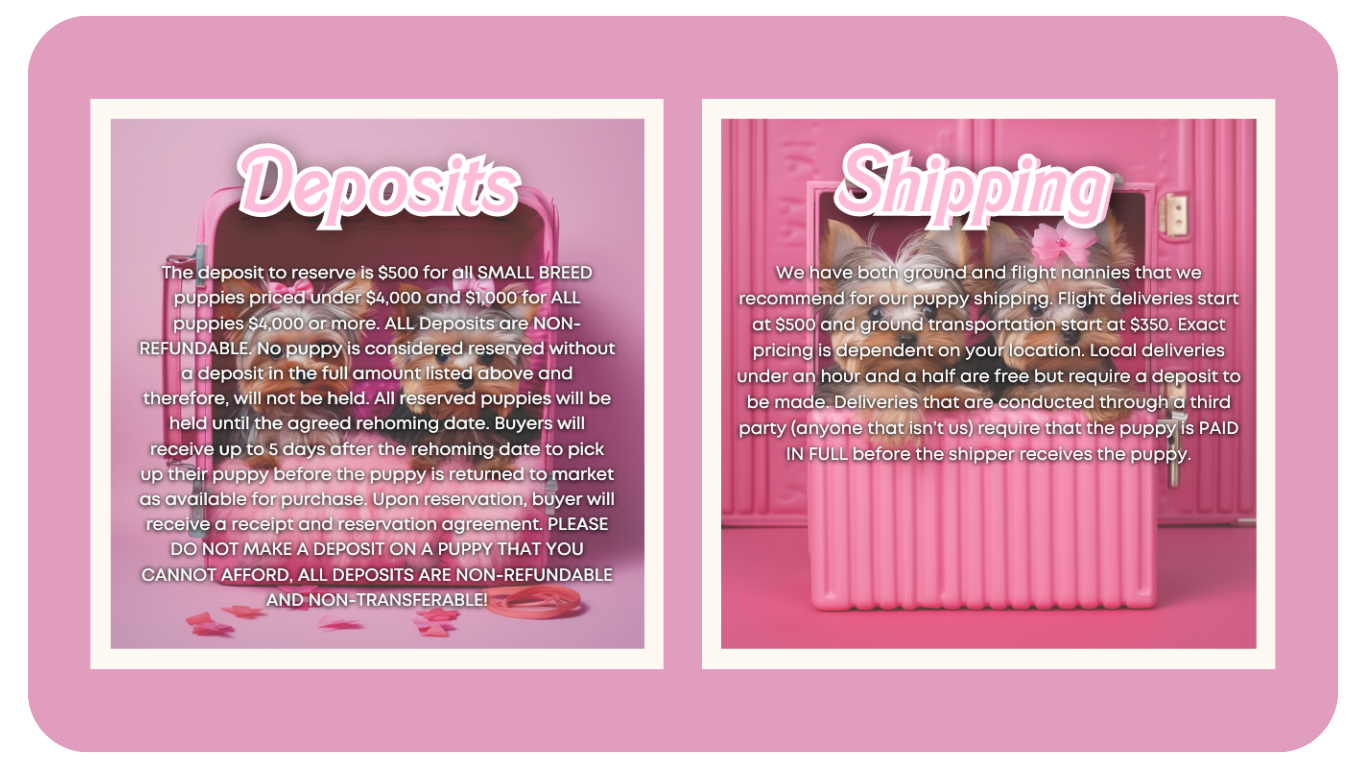 A little bit about us? Our names are Tommie & Coco. Prior to becoming the breeders that we are today Tommie once bred Pitbulls as a teenager. I personally never bred or owned dogs at all. However, one day in 2019 someone mistakenly texted pictures of a Morkie to Tommie’s phone, which I fell in love with! However, someone I missed out the puppy and had to purchase a Maltese and Yorkie in hopes of creating my own. After our first Morkie litter in 2020 I fell in love with breeding and we expanded into what you see today! We have a true passion for breeding and our dogs are our family. We genuinely love them.